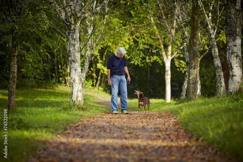 Fototapeta premium Wald Mann Hund Bäume Weg