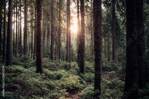 © ohenze, Fototapeta premium Wald mit Sonne, Fichtenwälder im Nationalpark Harz