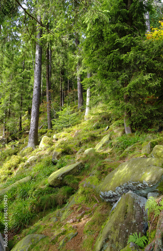 © DatenschutzStockfoto, Fototapeta premium Wald mit Stein und Laub mit Moos bedeckt Schwarzwald in Deutschland im Herbst