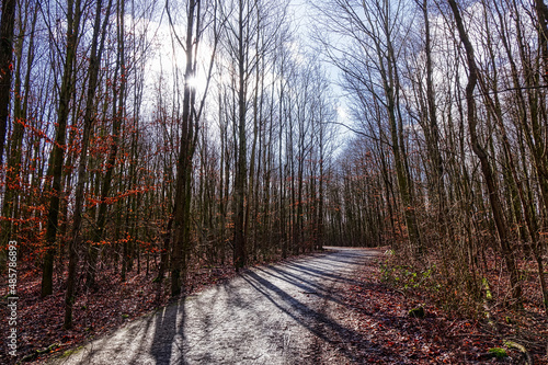 © hespasoft, Fototapeta premium Wald mit Wanderweg und Wintersonne