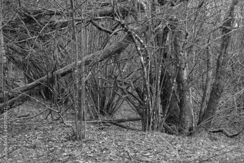 Obraz premium Wald oder Busch, Gebüsch in einer Landschaft mit Sträuchern und Bäumen im Gebiet einer Quelle