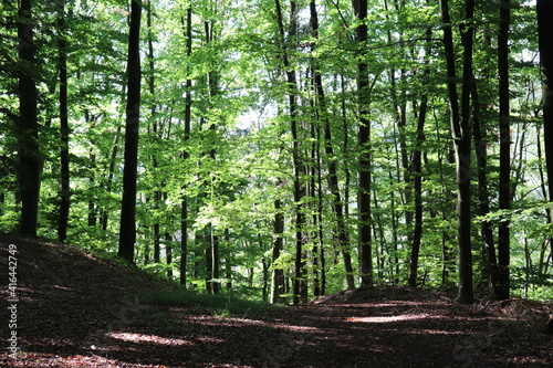 Fototapeta premium Wald Sommerwald Buchenwald Buchen Licht Sonne Bäume Wandern Wanderweg