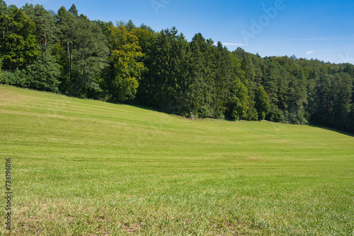 © Thomas Otto, Fototapeta premium Wald und Wiesen im Sommer bewölkter Himmel