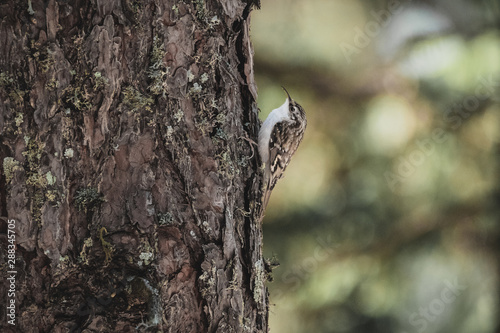 Obraz premium Waldbaumläufer auf Nahrungssuche auf Fichtenbaum