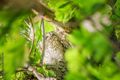 © Andre, Fototapeta premium Waldkauz im Kastanienbaum bei Abendsonne