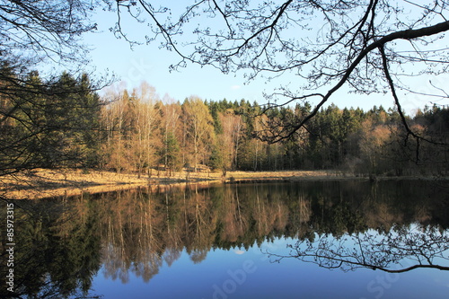 © Robert, Obraz premium Waldsee bei ruhigem Wasser mit Spiegelungen