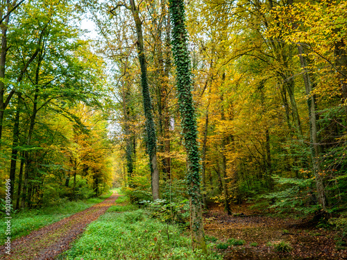 © focus finder, Obraz premium Waldweg durch den herbstlichen Wald