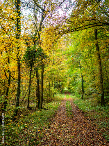© focus finder, Obraz premium Waldweg durch den herbstlichen Wald