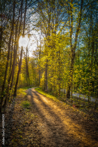 © dietwalther, Obraz premium Waldweg im Frühling mit Sonnenstrahlen im Gegenlicht