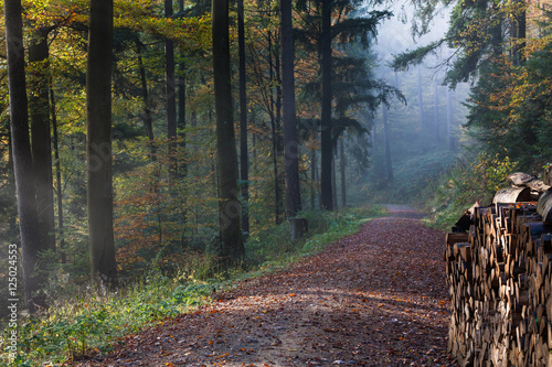 © ankenevermann, Fototapeta premium Waldweg mit Holzstoß