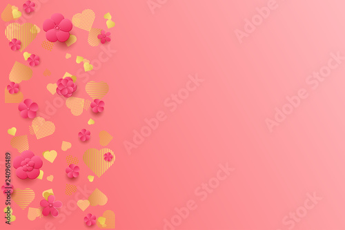 Naklejka premium Walentynki tło. Różowe kwiaty i złote serca