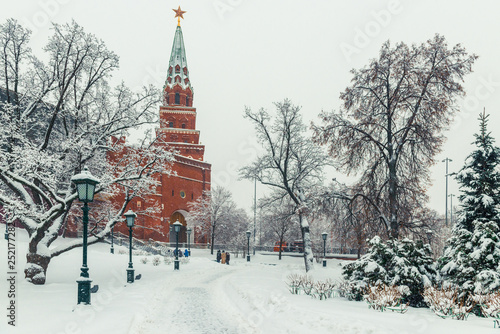 © kosmos111, Fototapeta premium Walk at the Kremlin walls in winter Moscow, cityscape, Russia