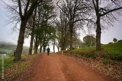 Fototapeta premium Walk in the countryside, woods with gravel road and dried up trees