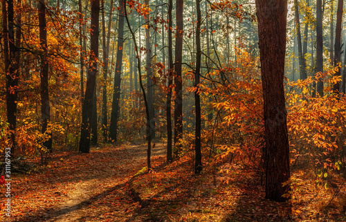 © Mykhailo, Obraz premium Walk in the woods. Pleasant autumn weather. Sun rays play in the branches of trees.