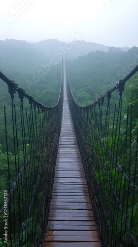 Obraz premium Walk Rainy Suspension Bridge Lush Forest