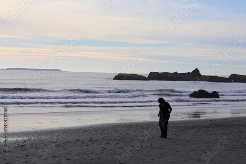 Naklejka premium Walker on the Pacific Beach just before sunset