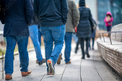 Naklejka premium Walking along High Line in Manhattan, New York City. Detail on moving people legs