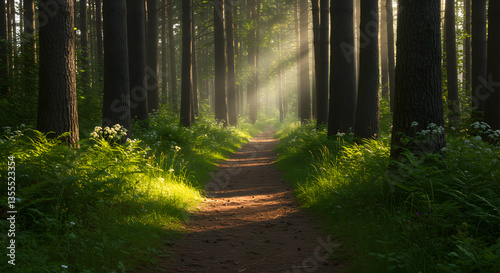 © MUHAMMAD, Fototapeta premium Walking Along Sunlight Dappled Path through Serene Forest Landscape