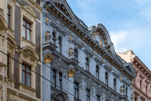Fototapeta premium Walking along the road, beautiful buildings of Vienna with blue sky...