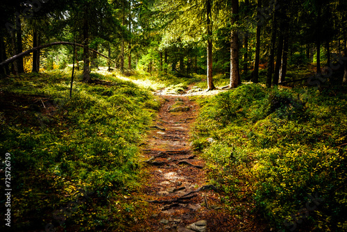 © Soaps, Fototapeta premium walking and hiking path in the swiss national park, parc naziunal svizzer - green and lush with some autumn touches