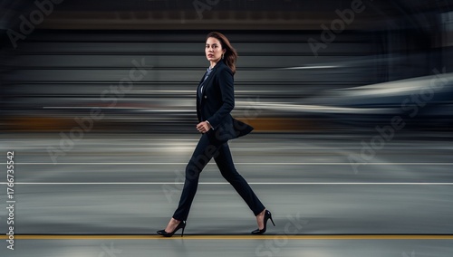 Fototapeta premium Walking businesswoman in suit crossing hangar floor, with yellow line, metal...