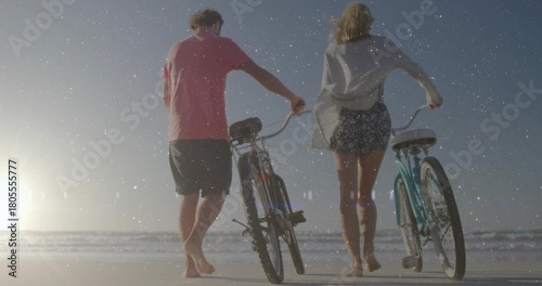 © vectorfusionart, Naklejka premium Walking couple wearing cover-up and pink tee pushing two bicycles on wet sand, low sun reflecting