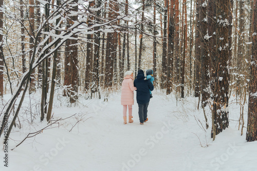 © Илона Удалова, Naklejka premium Walking family with a child. Family walks in nature in winter. Winter family walk in nature. A lot of snow.