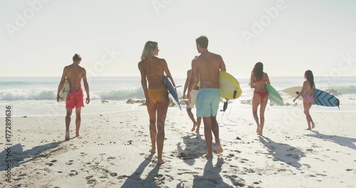 Naklejka premium Walking fit group of six surfers carrying colorful surfboards on sandy beach,...