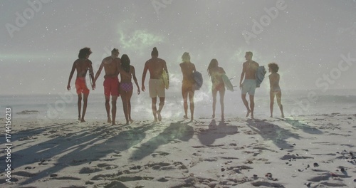 Fototapeta premium Walking group of eight surfers in swimwear carrying surfboards toward ocean...