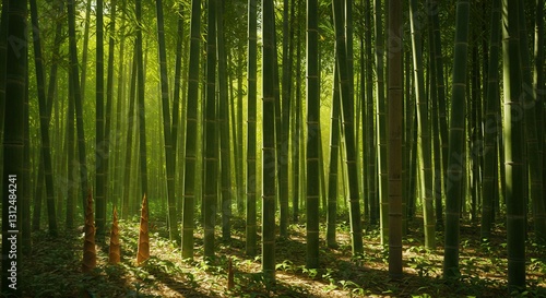 © BADRUN, Obraz premium Walking in Bamboo Forest with Sunlight Shining Through the Tall Stalks