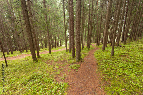 Obraz premium walking into the forest long a path in a cloudy day. No people a