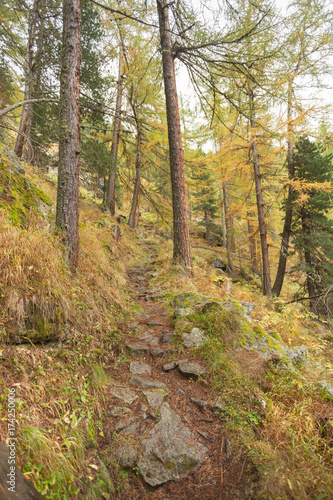 Fototapeta premium walking into the forest long a path in a cloudy day. No people around
