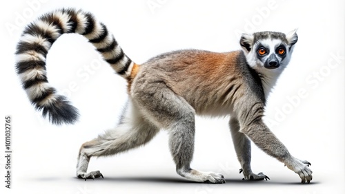 Fototapeta premium Walking lemur on a white background, perfect for wildlife and nature photography. Ideal for showcasing animal traits