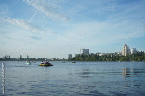 Naklejka premium Walking on a catamaran on a river in the city on a clear day.