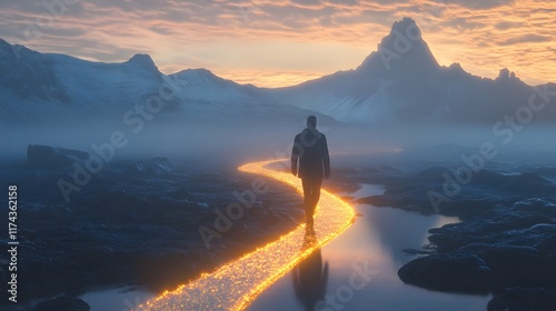 © MakeitEasy, Obraz premium Walking on a glowing path at dawn iceland nature photography tranquil landscape serene viewpoint dreamlike concept