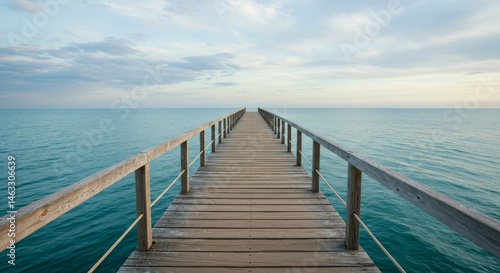 Obraz premium Walking on Wooden Pier Towards Calm Ocean Horizon