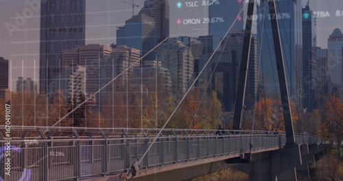 Fototapeta premium Walking pair in fall jackets crossing pedestrian suspension bridge among autumn trees, data overlay