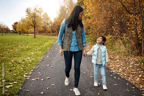 © Reese Coop/peopleimages.com, Fototapeta premium Walking, park and mother holding hands with girl for adventure, wellness and fresh air outdoors. Family, weekend and happy mom with young child on path for bonding, fun and relax together in nature