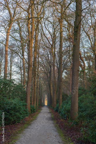 © ysbrandcosijn, Fototapeta premium Walking path between trees and rhododendrons in the winter.