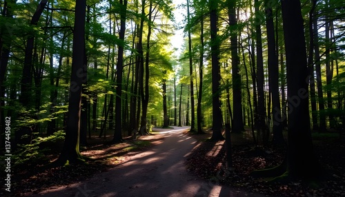 © Day, Obraz premium Walking Path Through Dense Forest with Sunlight Streaming Through Trees