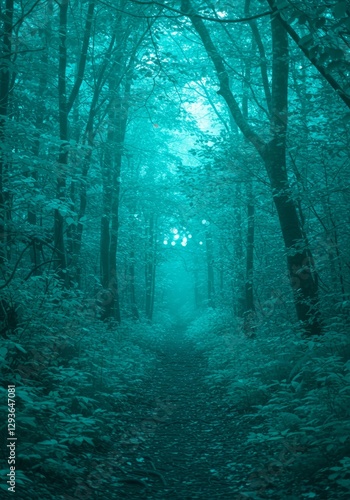 © Ziyasier, Obraz premium Walking Path Through Foggy Forest with Trees in Dark Teal Tone
