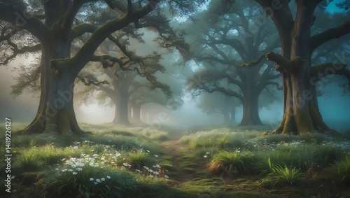 Naklejka premium Walking Path Through Foggy Forest With Wildflowers and Mossy Trees