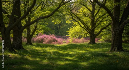 © abangaboy, Fototapeta premium Walking Path Through Green Forest with Pink Flowers and Sunlight
