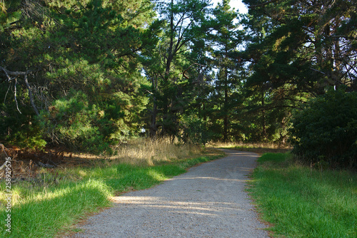 Fototapeta premium Walking path with green grass and trees at the sides