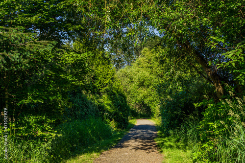© olegmayorov, Obraz premium walking pathway in a green forest park sunny spring day