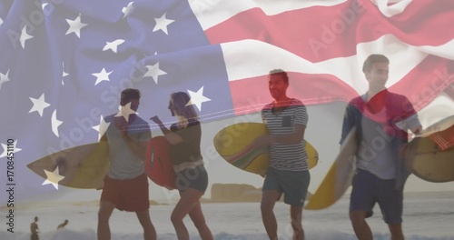 Naklejka premium Walking six friends in swimwear carrying surfboards on beach, with waves and American flag overlay