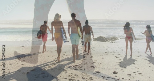 Obraz premium Walking surfers in swimwear carrying surfboards along beach at low tide with...