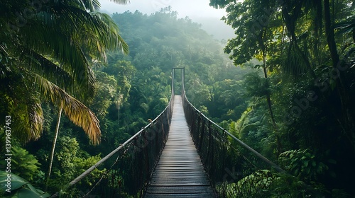 Fototapeta premium Walking Suspension Bridge Through Lush Tropical Rainforest Jungle