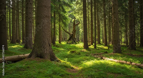 Obraz premium Walking Through a Dense Forest with Green Moss and Sunlight
