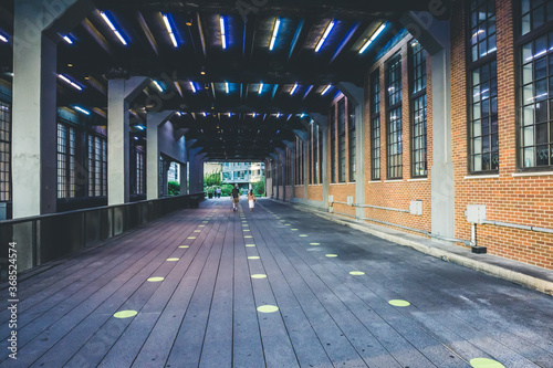 © Renata, Fototapeta premium Walking through a tunnel on High Line with dots on the floor for social distancing